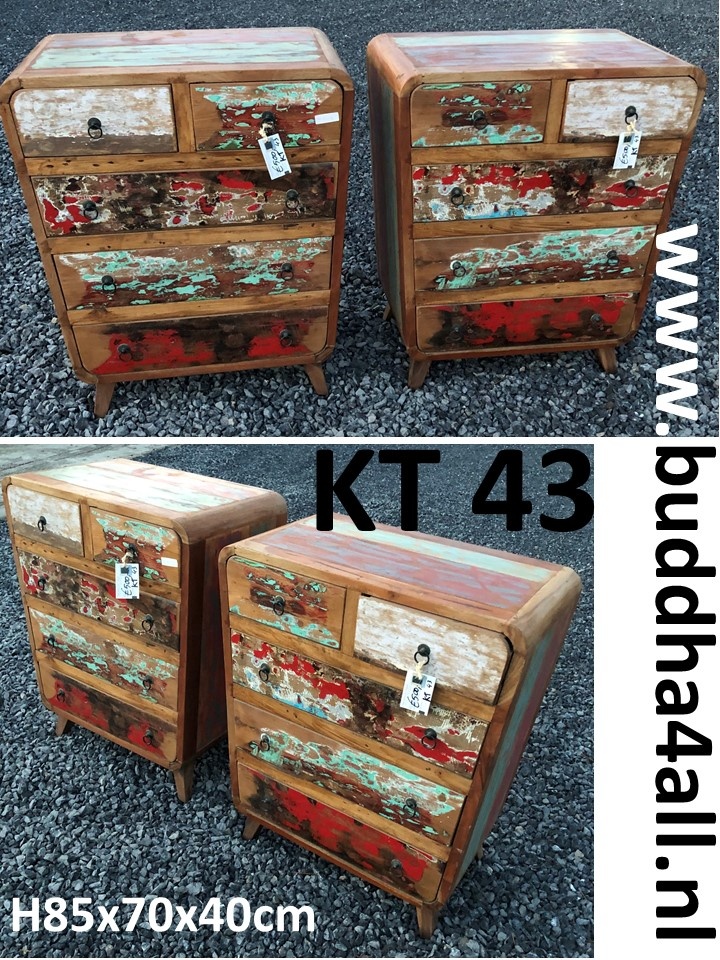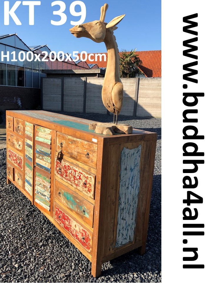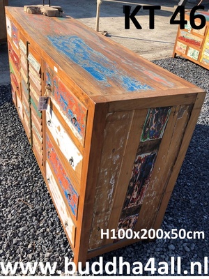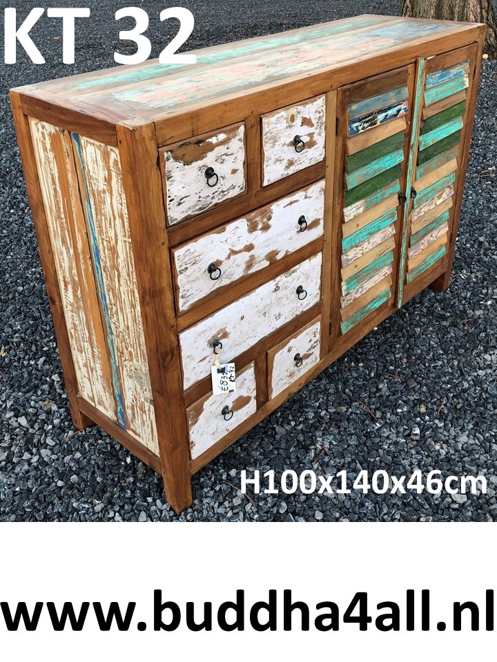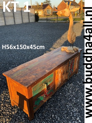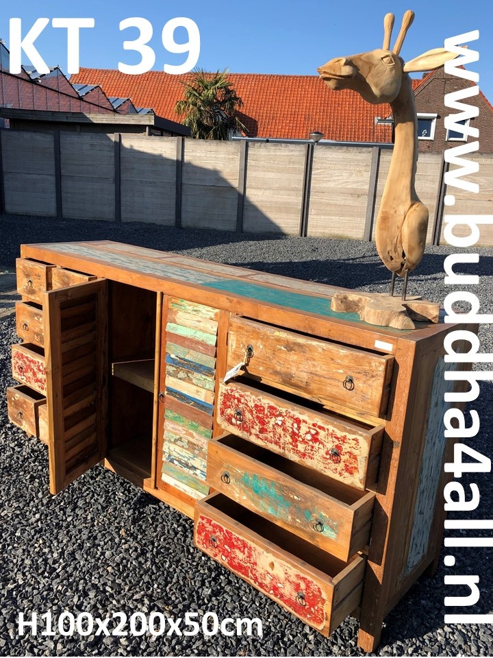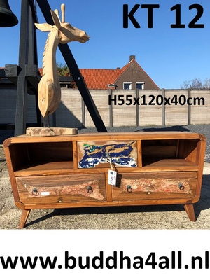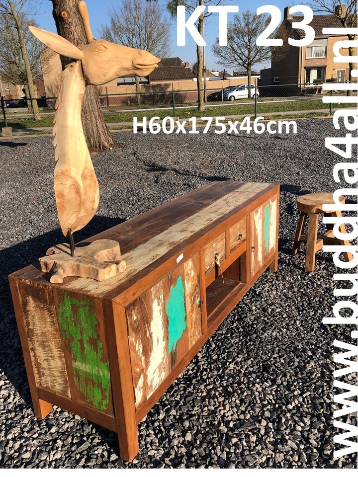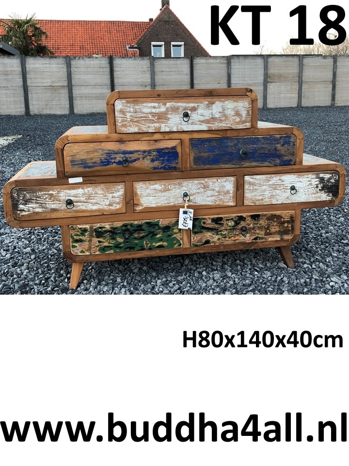 Tv meubel, uniek in vorm en kleur. Omdat het gerecycled hout is heeft ieder meubel natuurlijk een unieke uistraling. Maar dit tv-meubel heeft ook nog eens een erg retro model. Dit benadrukt het speelse karakter alleen nog maar meer! Ook een erge leuke combinatie met kast KT18, beneden in deze lijst te vinden.