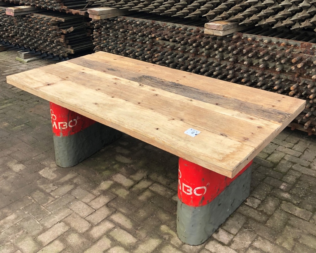 Industriële tafelpoten gemaakt van oude olievaten. In Indonesië worden de meest fantastische dingen gemaakt van oude olievaten. Ze worden geperst, in vorm geslagen en in elkaar gelast. Zo worden er diverse meubels van gemaakt, lampen, schermen en dus ook tafelpoten.