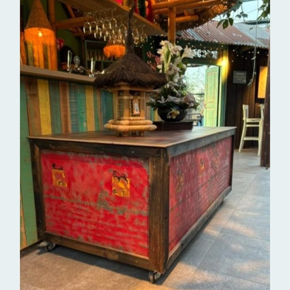 Oude olievaten platgeslagen tot metalen schermen. Naast olievat meubels hebben we dus ook deze decoratieve olievat schermen. Plaats het als stoere wandbekleding in een game room of speelkamer, al helemaal leuk als je het combineert met een olievat zithoek! Maak er bijvoorbeeld schuifdeuren van voor op een zolderruimte, om onder een schuin dak mooie opbergruimte te creëren. En zoals je kunt zien op foto is het zelfs mogelijk volledige gebouwen ermee te bekleden. Dus de mogelijkheden zijn eindeloos!