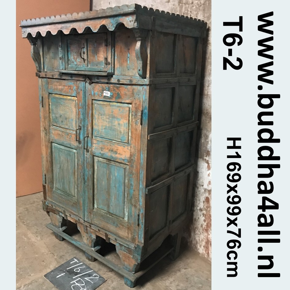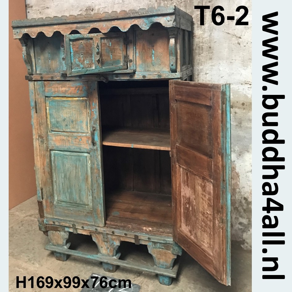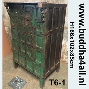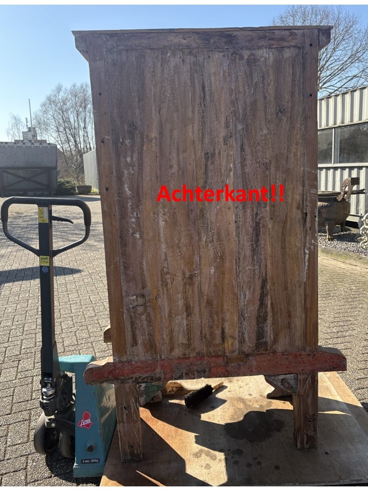 Geheel orginele oude kast uit India. Met vier grote deuren is de volledige ruimte in de kast te gebruiken. Bovenin door het glas in de kast kan mooi servies, foto's, reis aandenken, boeken etc. geëtaleerd worden. Onderin is evenveel ruimte voor allerlei praktische zaken.