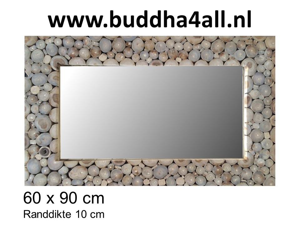 Spiegel boomringen 60 x 90 cm Aantal: € 119,00 Spiegel met houten lijst bekleed met teakhout boomringen / jaarringen. Deze spiegel is 60 x 90 cm groot en heeft een lijst van 10 cm dik.